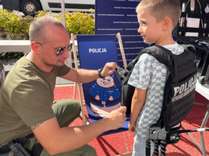 Najmłodsi chętnie korzystali z okazji, aby choć na chwilę poczuć się jak prawdziwi funkcjonariusze – mogli przymierzyć policyjne czapki, kask, kamizelkę, a także zrobić sobie pamiątkowe zdjęcia.