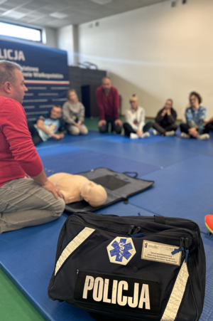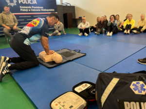 -zasady udzielania pierwszej pomocy w nagłych przypadkach zdrowotnych – uczestnicy ćwiczyli m.in. resuscytację krążeniowo-oddechową, użycie defibrylatora AED oraz prawidłowe postępowanie w sytuacjach nagłych, w tym zasadę powierzenia pomocy, czyli skutecznego zorganizowania wsparcia i współdziałania z innymi osobami w sytuacji zagrożenia życia lub zdrowia.