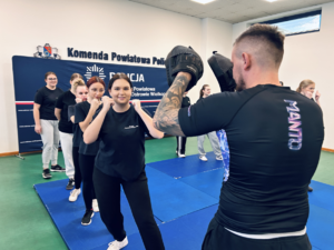 W drugiej części warsztatów odbyły się zajęcia z samoobrony, prowadzone przez doświadczonych policjantów. Uczestniczki miały możliwość nauczyć się podstawowych technik obronnych, które mogą przydać się zarówno w życiu codziennym, jak i w przyszłej służbie.