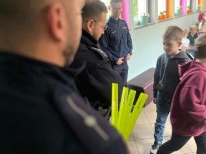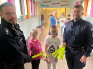 Podczas spotkania policjanci w przystępny sposób omówili najważniejsze zasady bezpieczeństwa – zarówno dla pieszych, jak i rowerzystów. Dzieci dowiedziały się m.in., jak prawidłowo przechodzić przez jezdnię, dlaczego warto nosić odblaski oraz jak unikać niebezpiecznych sytuacji w ruchu drogowym. Każdy uczestnik otrzymał też odblask, który poprawia widoczność po zmroku i zwiększa bezpieczeństwo na drodze.