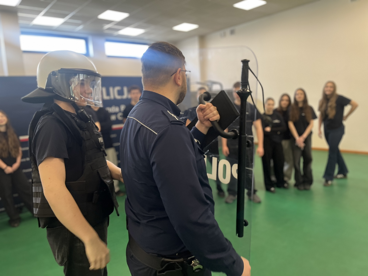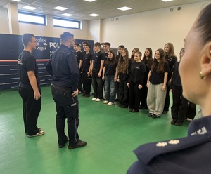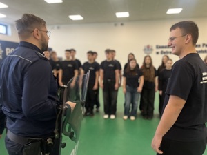 Podczas wizyty uczniowie wzięli udział w zajęciach z zakresu musztry. Pod okiem funkcjonariuszy poznali podstawowe komendy oraz zasady prawidłowego ustawiania się w szyku, poruszania się w kolumnie. Ćwiczenia te miały na celu kształtowanie dyscypliny, współpracy w grupie oraz odpowiedzialności za wykonywane zadania. Musztra jest ważnym elementem szkolenia służb mundurowych, dlatego uczniowie mogli przekonać się, jak wygląda ona w praktyce i jakie znaczenie ma w codziennej służbie.